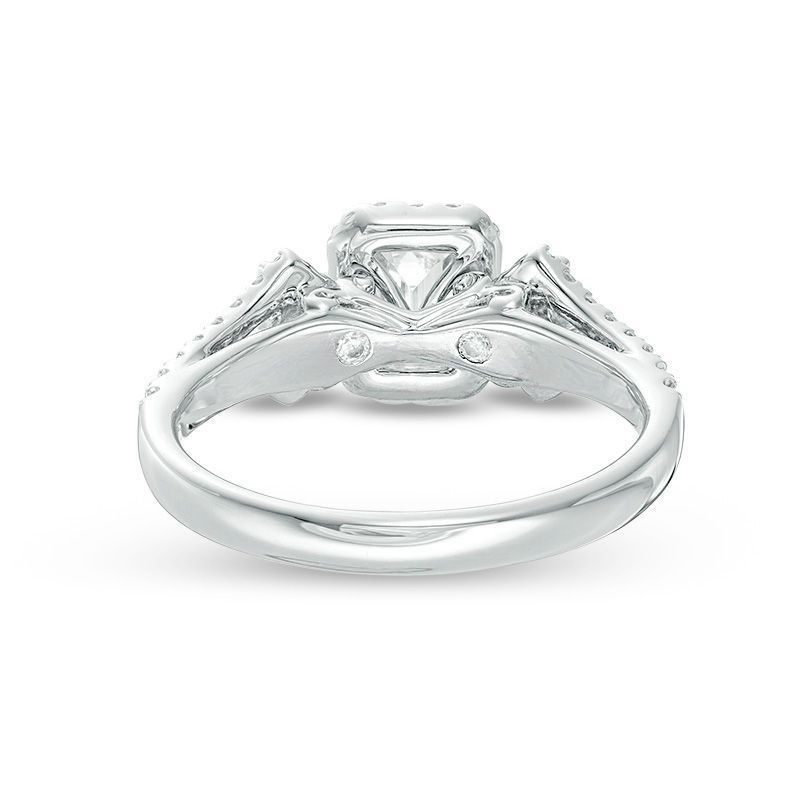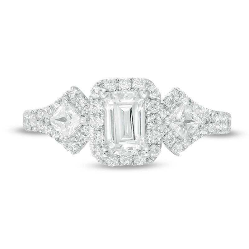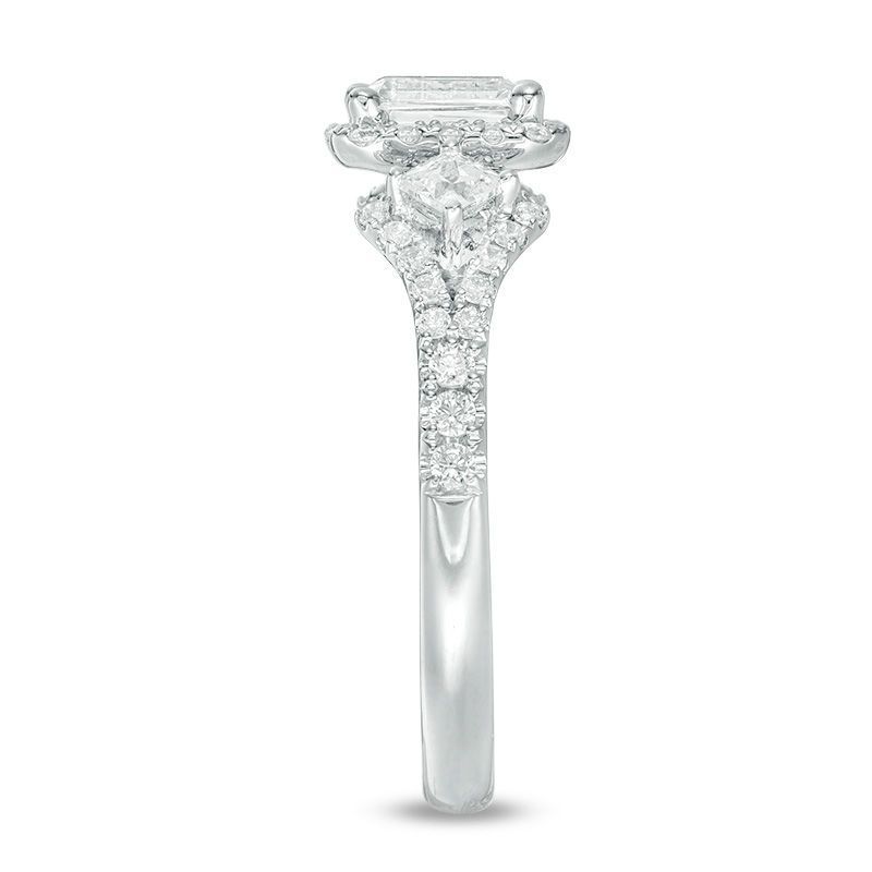 honor her with the sparkling look of this diamond engagement ring. Crafted in 14K white gold, this elegant choice features a 1/2 ct. certified emerald-cut diamond flanked by 1/10 ct. princess-cut diamonds �?all boasting a color rank of I and clarity of I1. Smaller diamonds decorate the design. and set with two accent diamonds, a beautiful reminder of your promise to always be by her side. Radiant with 1 ct. t.w. of diamonds and a brilliant buffed luster, this engagement ring is a beautiful reminder of your love. This style arrives with a certificate that includes a photo and description of the diamond, which guarantees quality and can be used for insurance purposes.