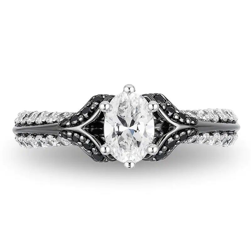 - Chevron-shaped black rhodium-plated collars highlight the center stone with black diamonds.