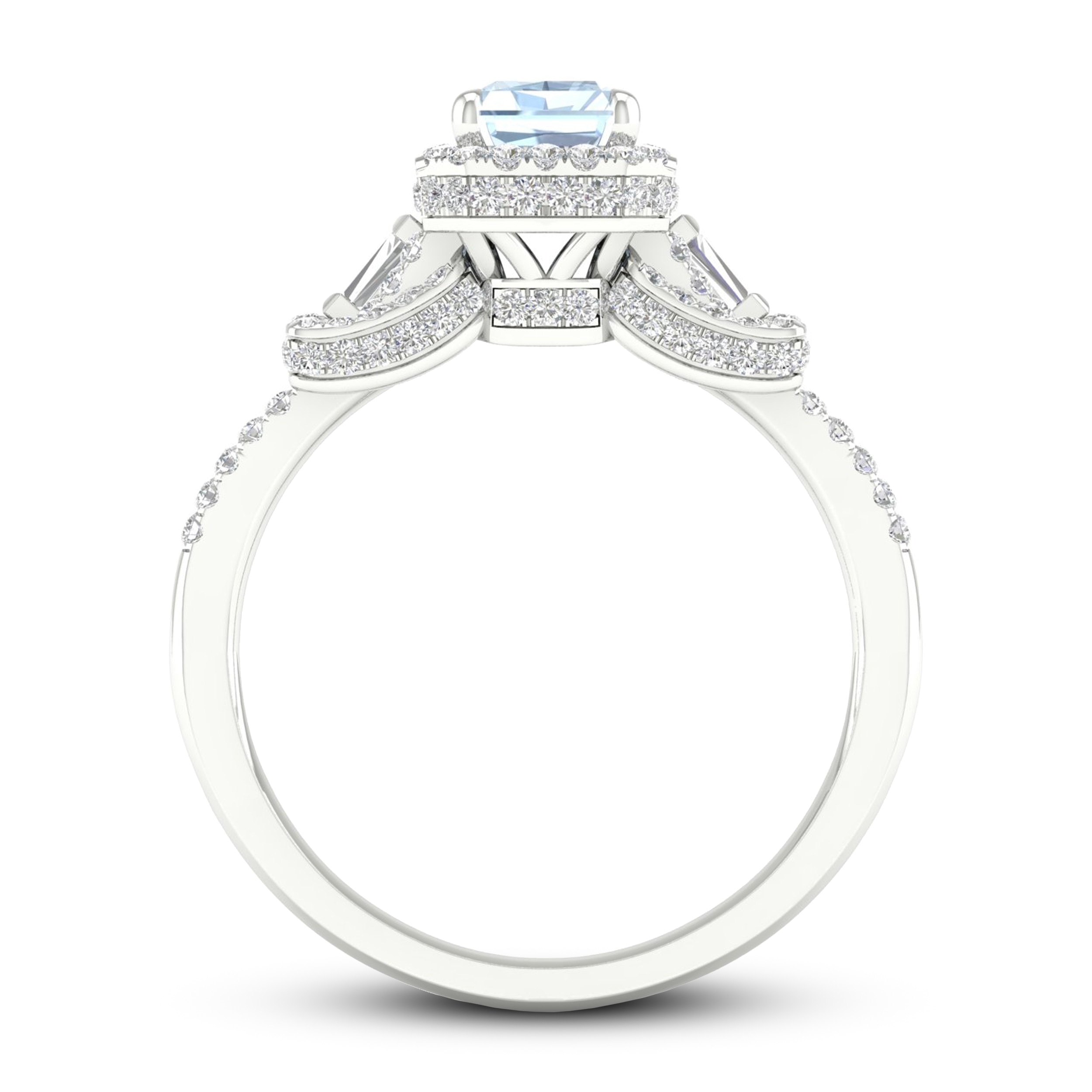 Unforgettable and whimsical, this romantic diamond engagement ring is a perfect way to show your everlasting love. The ring is styled in 10K white gold and features an enchanting emerald-cut aquamarine gemstone in the center. Sparkling round and baguette-cut diamonds perfectly frame the sides of the aquamarine gemstone and grace the band to give the ring a total diamond weight of 1/2 carat.